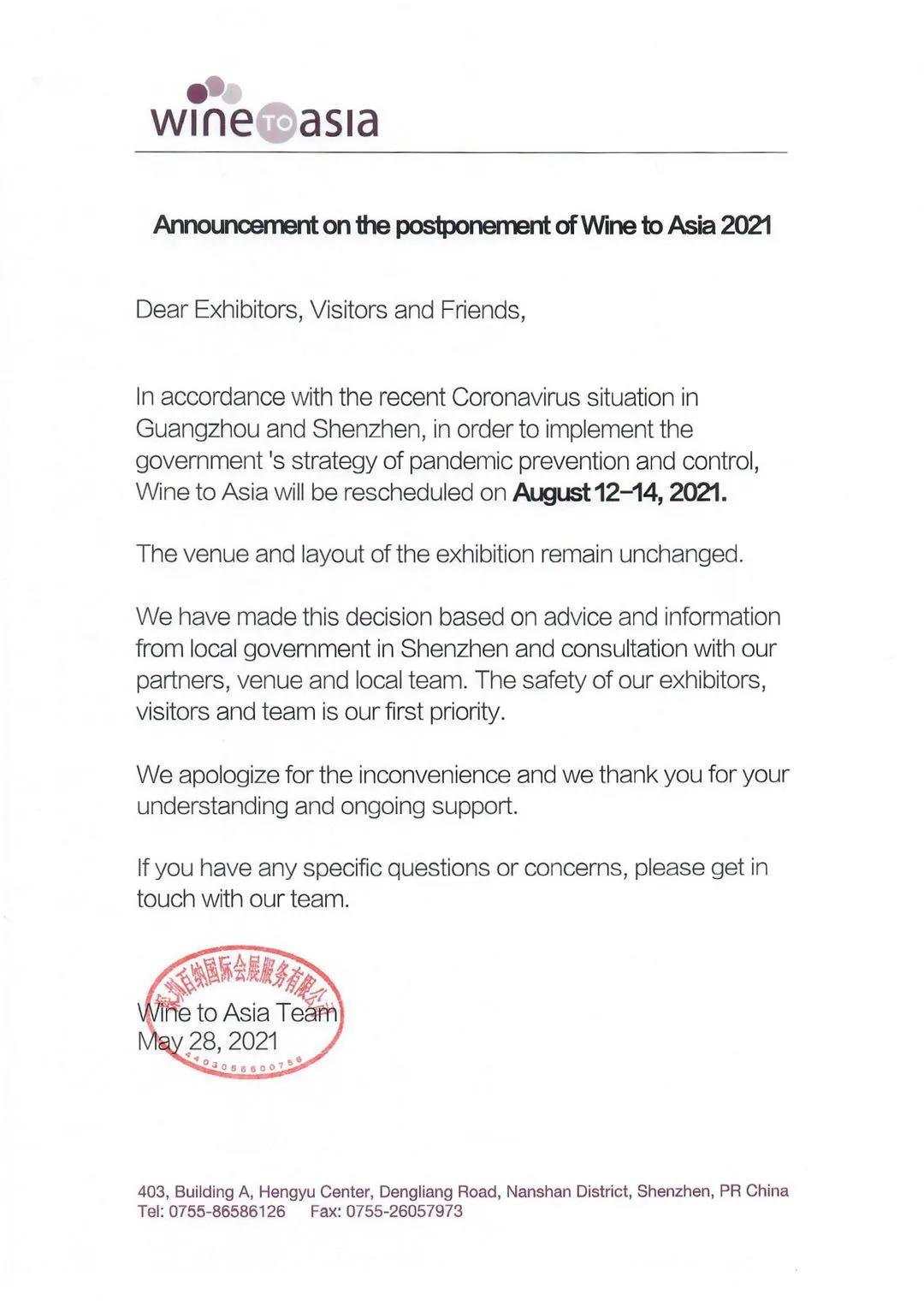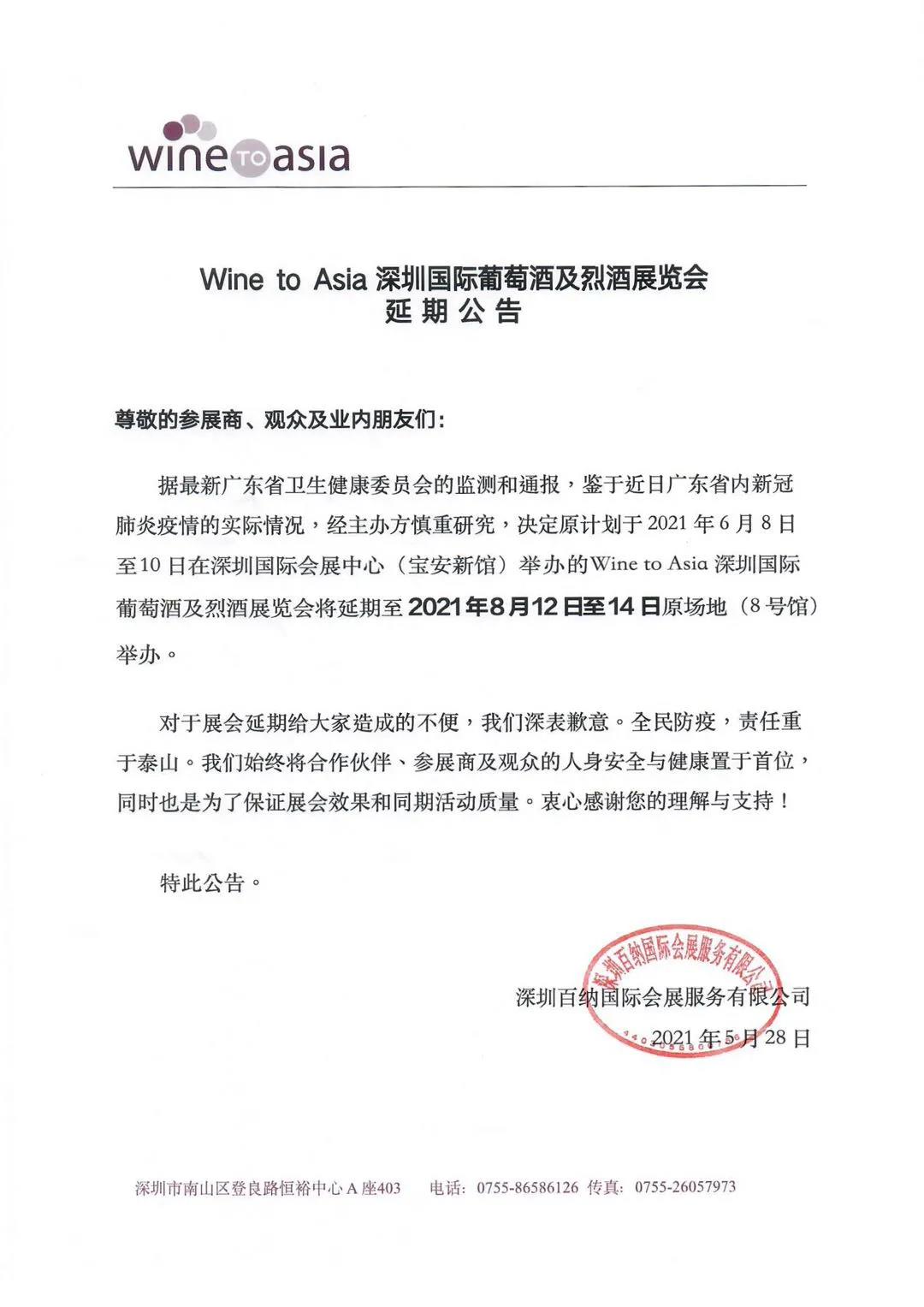 根據(jù)廣東省及深圳市有關(guān)部門(mén)的最新通知,因防疫工作的要求,全部展會(huì)暫緩舉行。原定于2021年6月8-10日舉辦的深圳國(guó)際葡萄酒及烈酒展覽會(huì)將延期至2021年8月12-14日,地點(diǎn)維持不變。
