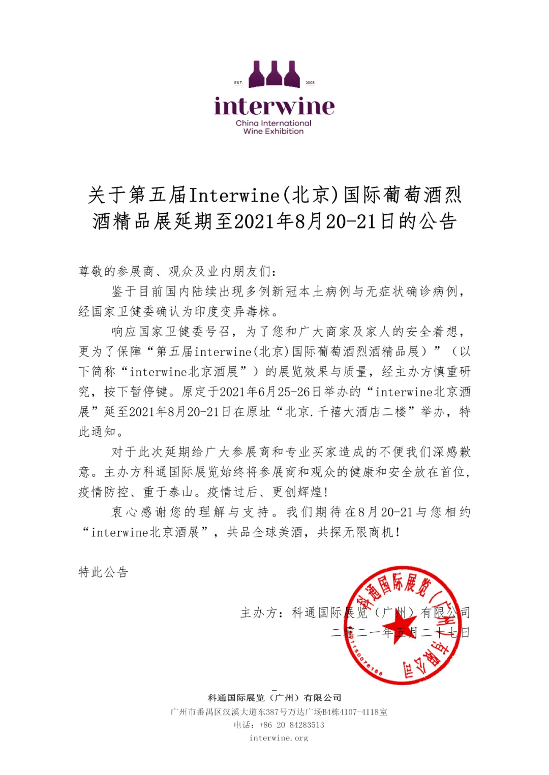關于第26屆Interwine中國(廣州)國際名酒展延期定檔的官方公告