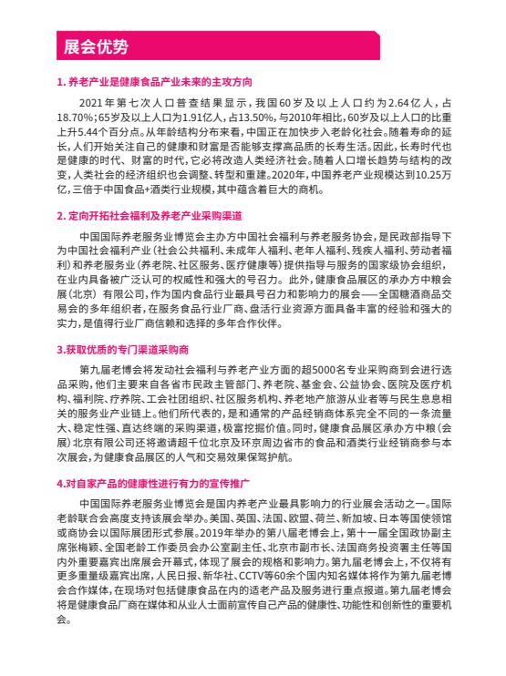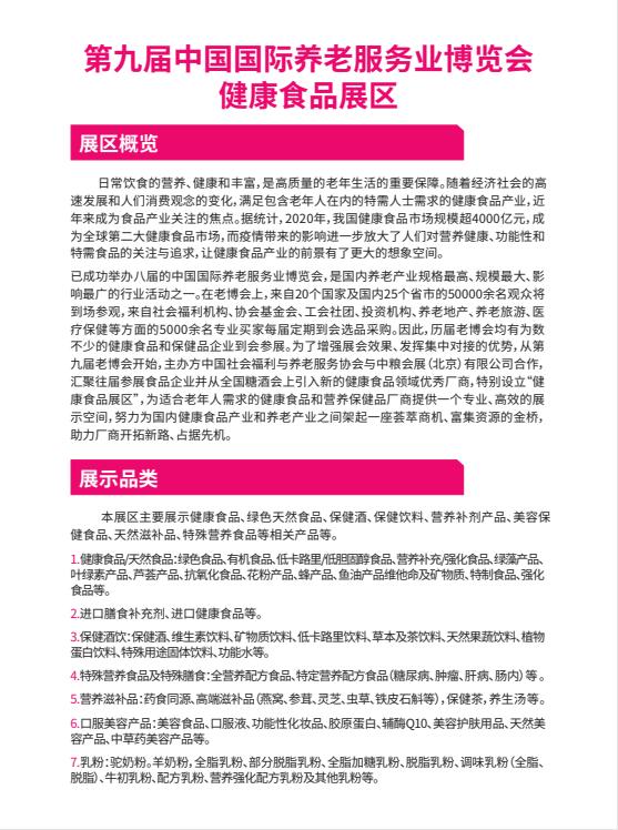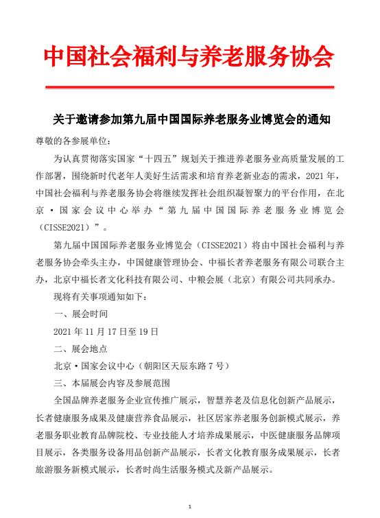 第九屆中國國際養(yǎng)老服務(wù)業(yè)博覽會(huì)(CISSE2021)將由中國社會(huì)福利與養(yǎng)老服務(wù)協(xié)會(huì)牽頭主辦,中國健康管理協(xié)會(huì)、中福長者養(yǎng)老服務(wù)有限公司聯(lián)合主辦,北京中福長者文化科技有限公司、中糧會(huì)展(北京)有限公司共同承辦。