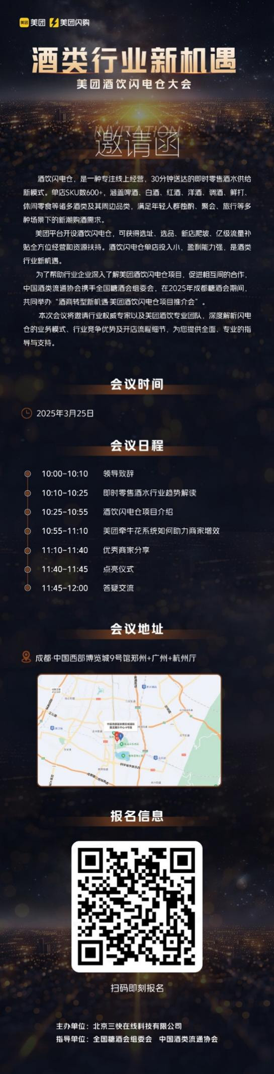 本次會議將邀請行業(yè)權(quán)威專家以及美團(tuán)閃購酒飲專業(yè)團(tuán)隊,深度解析酒飲閃電倉的業(yè)務(wù)模式、行業(yè)競爭優(yōu)勢、合作流程以及扶持政策,為您提供全面、專業(yè)的指導(dǎo)與支持。如您希望深入了解美團(tuán)酒飲閃電倉,歡迎掃描海報底部二維碼,或點擊文末“閱讀原文”報名參展,期待與您攜手共創(chuàng)酒飲零售新未來!