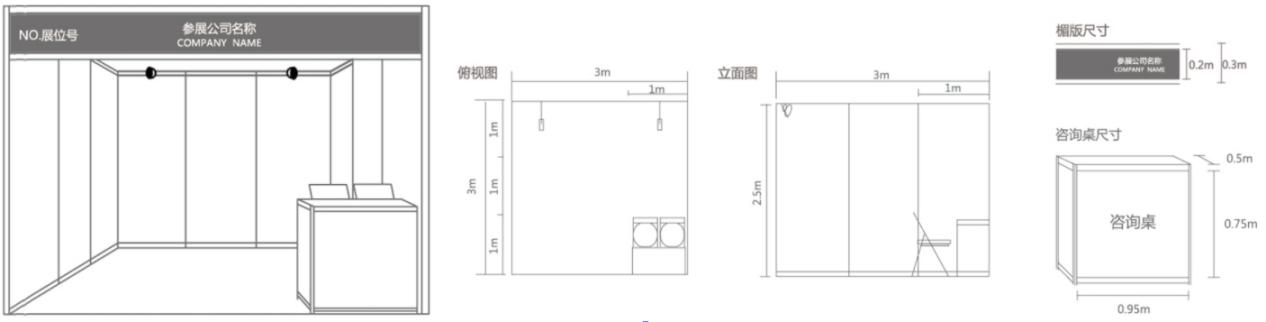 (1)標(biāo)準(zhǔn)展臺采用國際標(biāo)準(zhǔn)展架,鋁合金構(gòu)架,三面展墻,中、外文楣板字,兩只射燈,一張洽談桌,兩把椅子,一個220V/5A/400W電源插座。