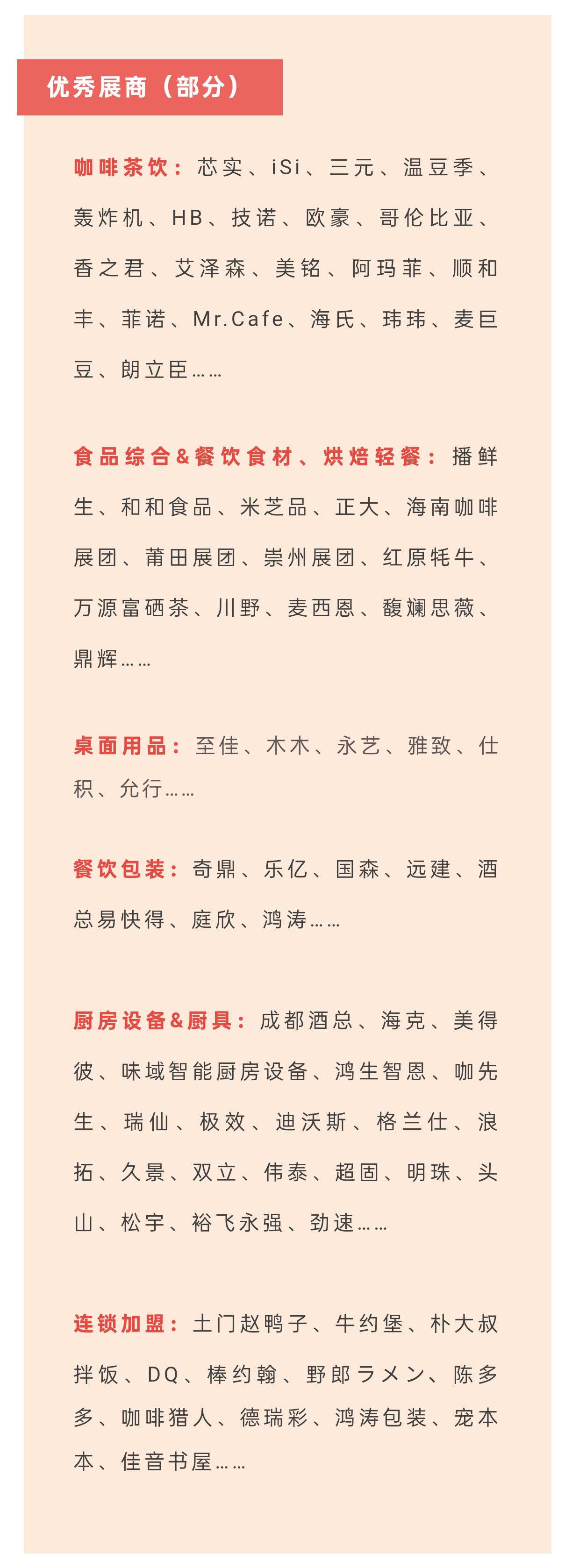 3天展會期間,預計吸引60000+來自酒店、咖啡館店、小食店/快餐店/燒烤店火鍋店為代表的酒店和餐飲終端渠道的專業(yè)觀眾,與現場展商一起,實現產業(yè)鏈上下游齊力協(xié)同,打通關聯(lián)產業(yè)關鍵節(jié)點,促進產業(yè)生態(tài)共融共生,帶動場景、產品和技術創(chuàng)新應用,助力行業(yè)不斷開拓新渠道、新場景、新應用,開拓增量空間,實現更加開放性的增長。