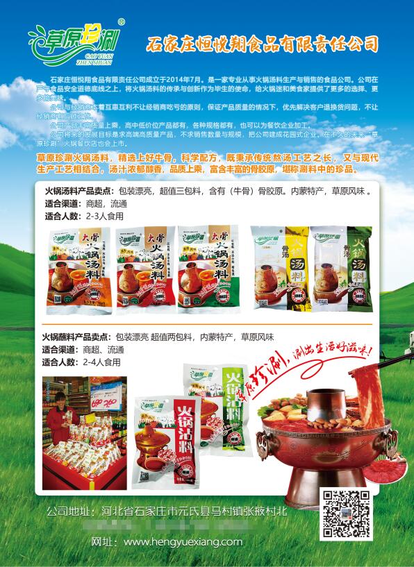 草原珍涮火鍋湯料,精選上好牛骨,科學配方,即秉承傳統(tǒng)熬湯工藝之長,又與現(xiàn)代生產(chǎn)工藝相結合,湯汁濃郁醇香,品質上乘,富含豐富的骨膠原,堪稱涮料中的珍品。