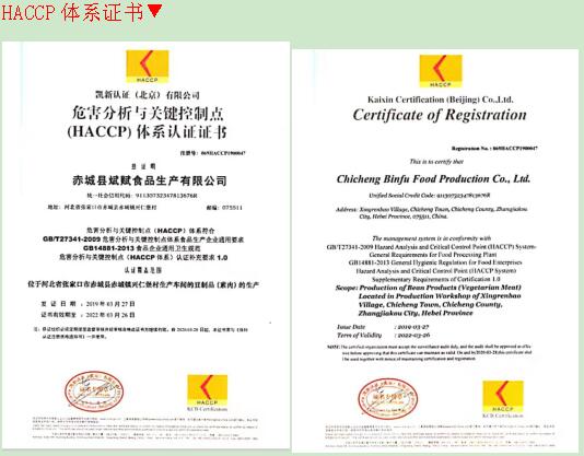 公司作為殘疾人雙創(chuàng)基地,生產(chǎn)的豆扣、豆花等大豆蛋白系列產(chǎn)品技術(shù)先進,品質(zhì)一流,深受消費者歡迎,市場供不應求。赤城縣斌賦食品生產(chǎn)有限公司在成立之初就高起點,引入了HACCP體系,HACCP體系是國際上共同認可和接受的食品安全保證體系,主要是對食品中微生物、化學和物理危害進行安全控制。我公司的食品生產(chǎn)嚴格按照本體系進行操作,每個環(huán)節(jié)都有專業(yè)人員把關(guān),我公司的大豆素肉產(chǎn)品能廣受國內(nèi)外市場歡迎,正是由于我們的生產(chǎn)是建立在良好的操作規(guī)范和衛(wèi)生標準操作程序上。