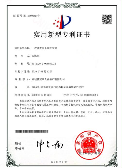 2019年我公司取得高新技術(shù)6項專利,其中包含面條制作專利。