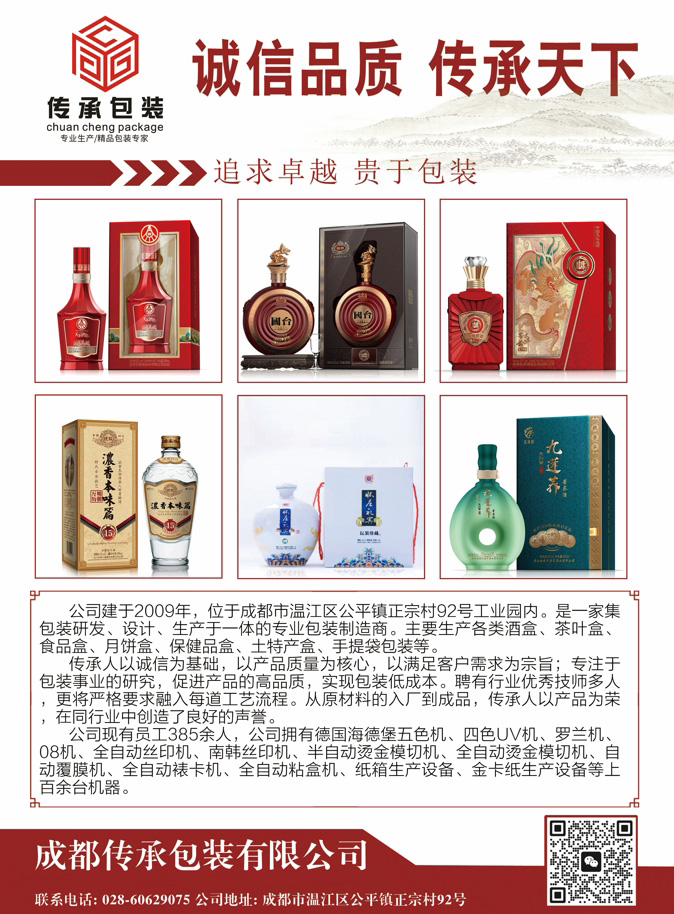 公司建于2009年,位于成都市溫江區(qū)公平鎮(zhèn)正宗村92號工業(yè)園內。是一家集包裝研發(fā)、設計、生產于一體的專業(yè)包裝制造商。主要生產各類酒盒、茶葉盒、食品盒、月餅盒、保健品盒、土特產盒、手提袋包裝等。